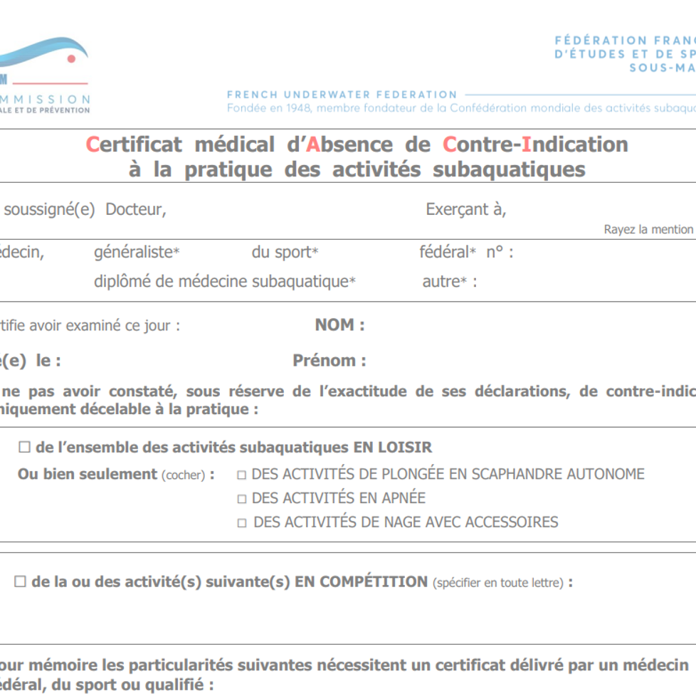 Votre médecin généraliste peut vous délivrer ce certificat (toutefois, une consultation chez un médecin fédéral peut s'avérer préférable dans certaines situations). Vous pouvez consulter la liste des médecins fédéraux ICI. Retrouvez également la fiche pratique de la FFESSM ICI.
